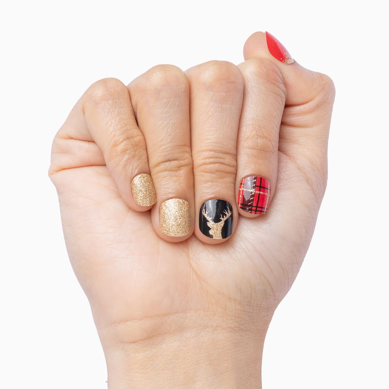 You can rule the holiday season with this beautiful mixed manicure set featuring deep, glossy reds topped with gold glitter snowflakes, a design featuring a hint of a white snowflake at the cuticle, full-glam gold glitter, and an accent wrap of reindeer antlers with a crown of roses set against a white background. Yes, queen! Extend your reign by adding a layer of top coat.