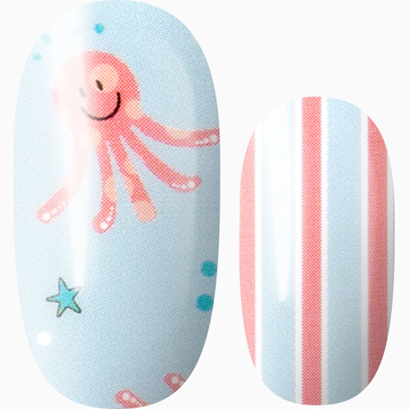 One of our most popular sets, Sea Fairy features pink and blue iridescent glitter against a glossy light blue background. A friendly reminder to all the water-loving mermaids: add a layer of top coat to protect this fantasy mani.