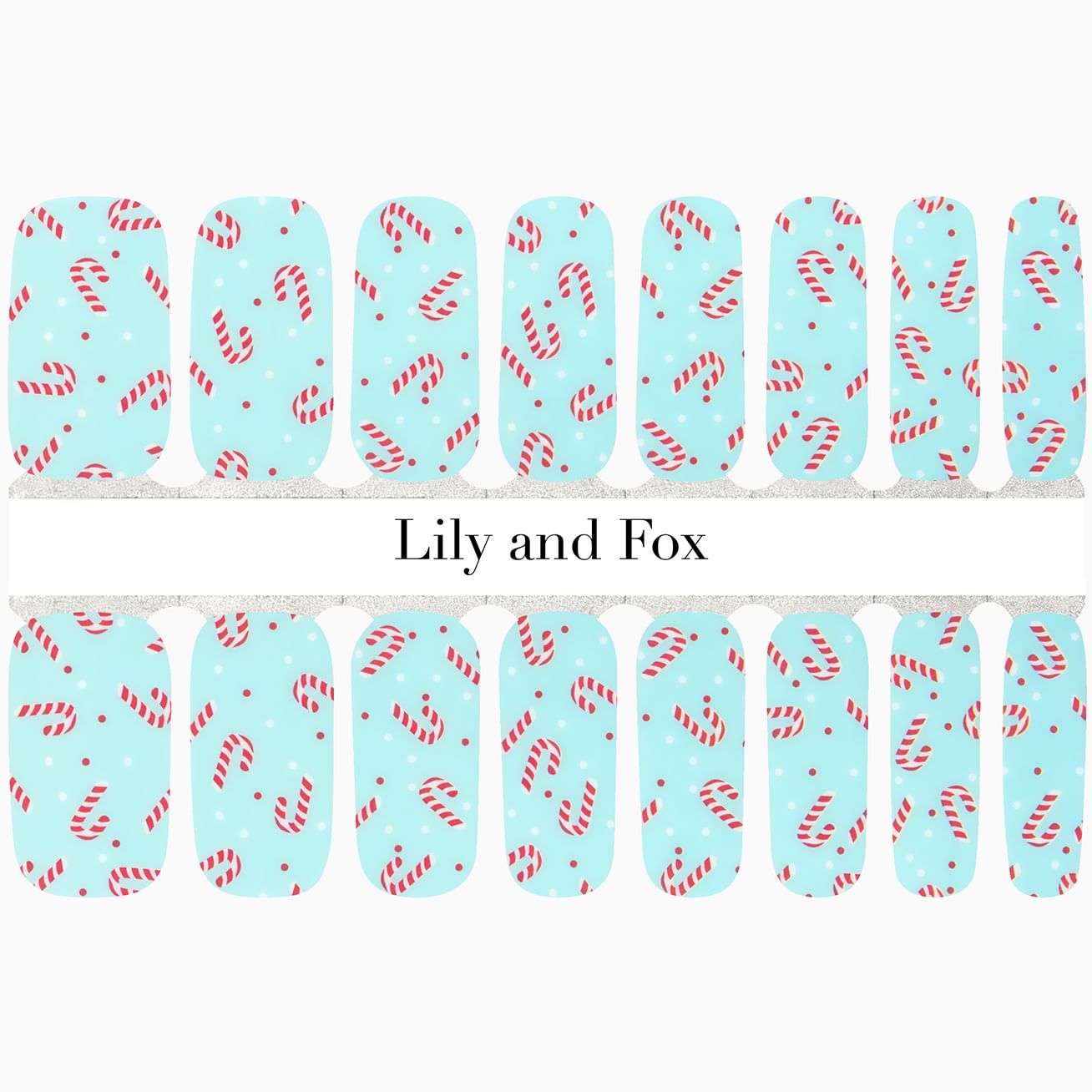 This manicure is sure to delight your fingertips with cheery candy canes and dots set against a light blue background. This nail wrap set is perfect for short and long nails with its repeating design that covers the full nail. Keep this look minty fresh longer by adding a top coat.