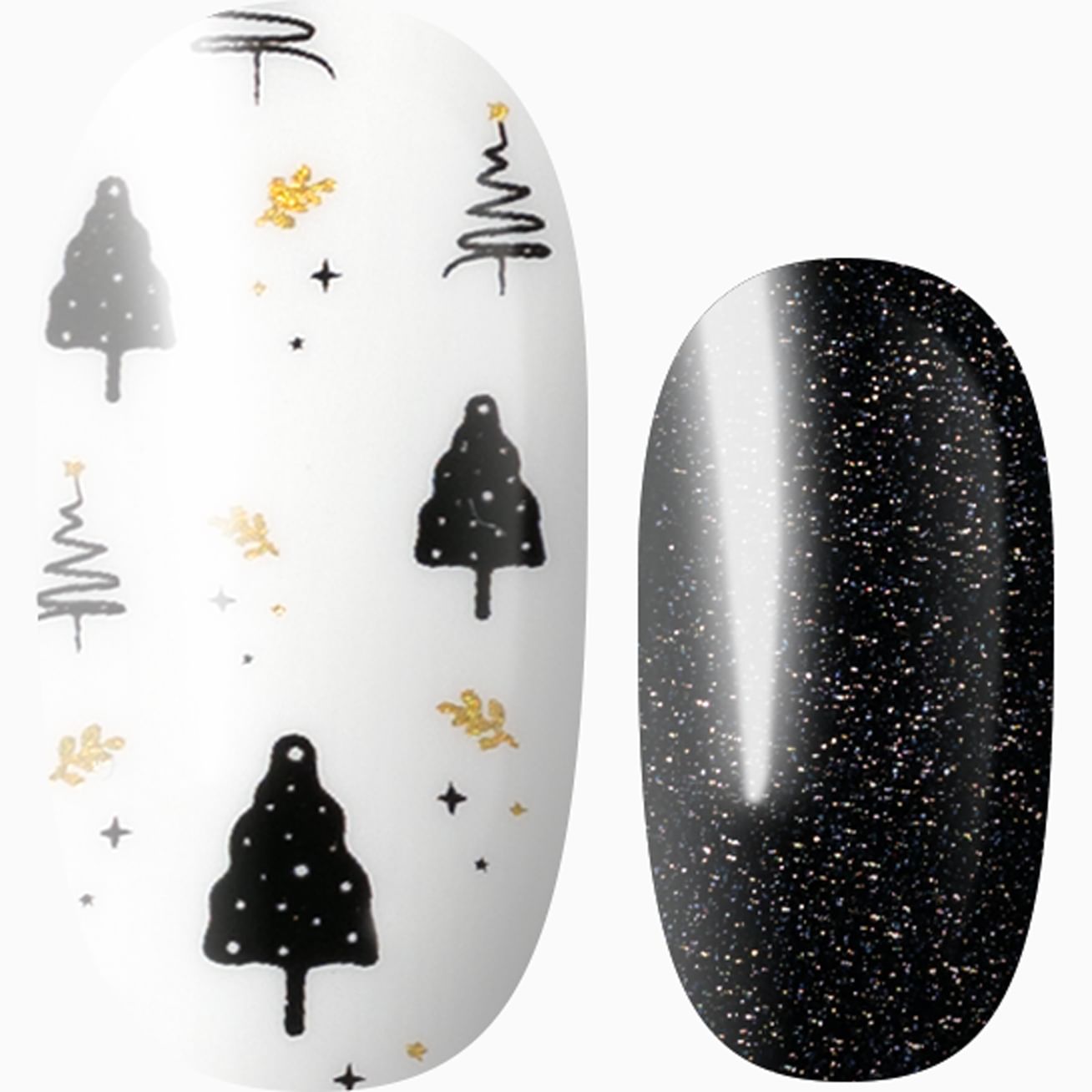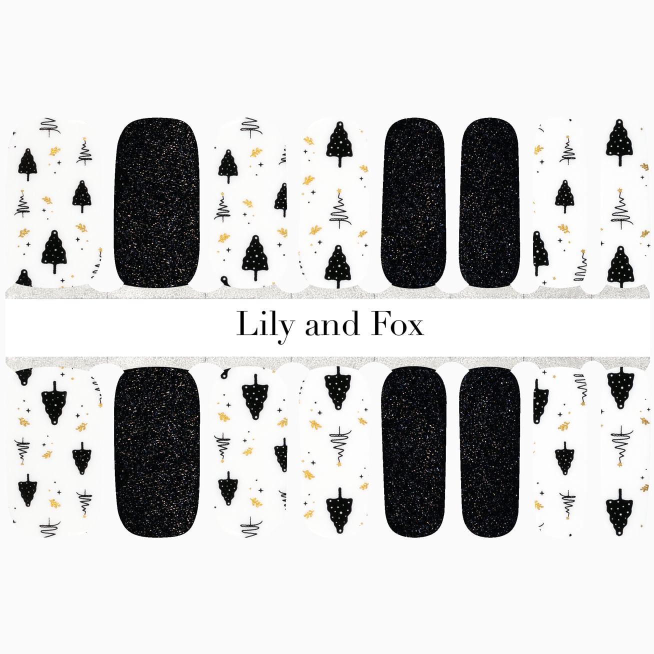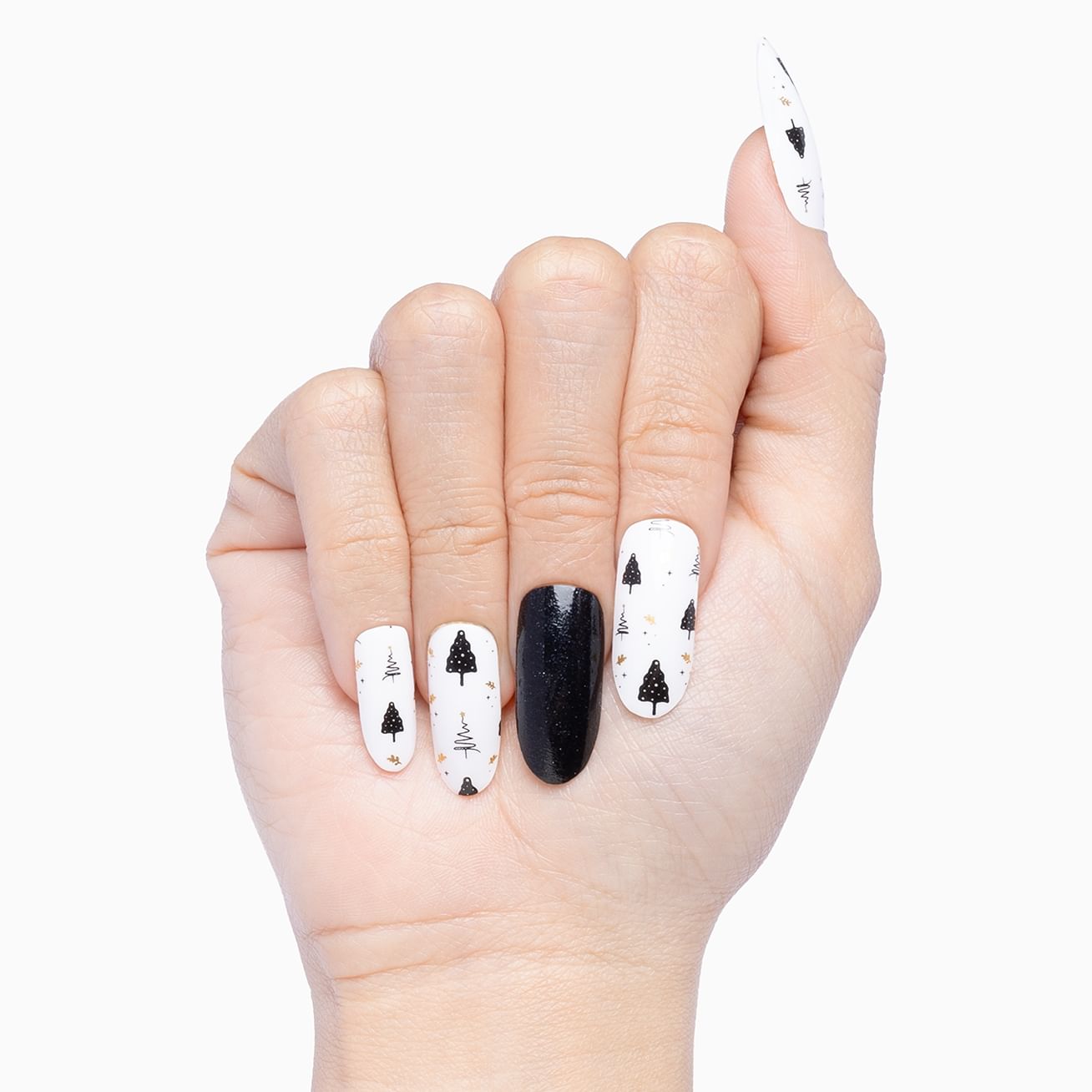 Black and white has never looked more chic than with this dynamic nail wrap set with dramatic black-on-black glitter and black trees against a glossy, white background with glints of metallic gold. Apply this manicure in minutes for a look that will last for weeks.