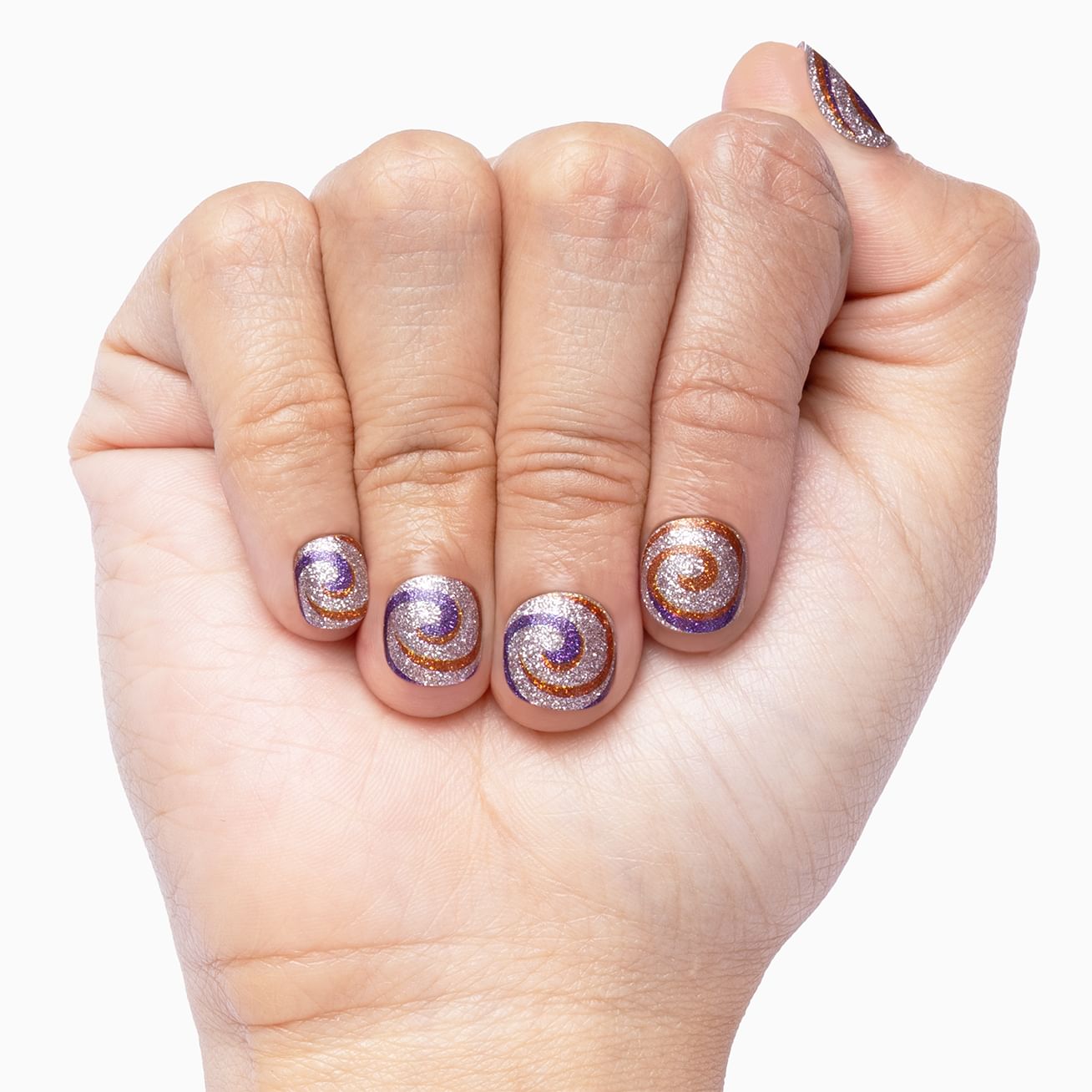 Sherbet Swirls features spirals of deep indigo-purple and copper against a silver background for this hypnotizing all-glitter manicure. Put this spell on your nails in minutes, with this mani designed to withstand all the whirls and twirls of your toughest everyday tasks.