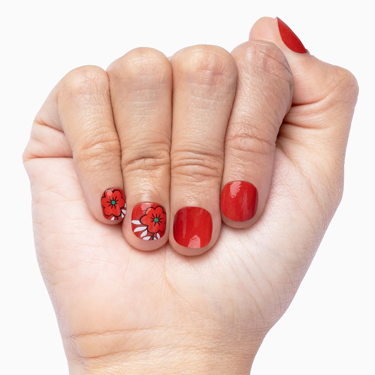 Passionate Petals feature a red floral design with dramatic white leaves cascading across the nail set against a classic red manicure. Fall in love with these wraps that pop on in minutes with more staying power than a fresh-cut bouquet.