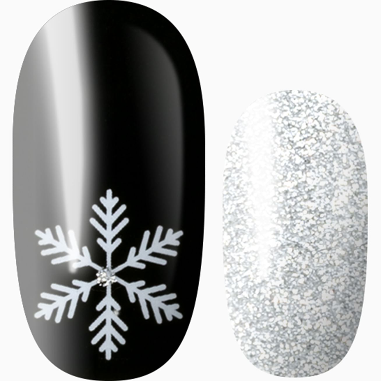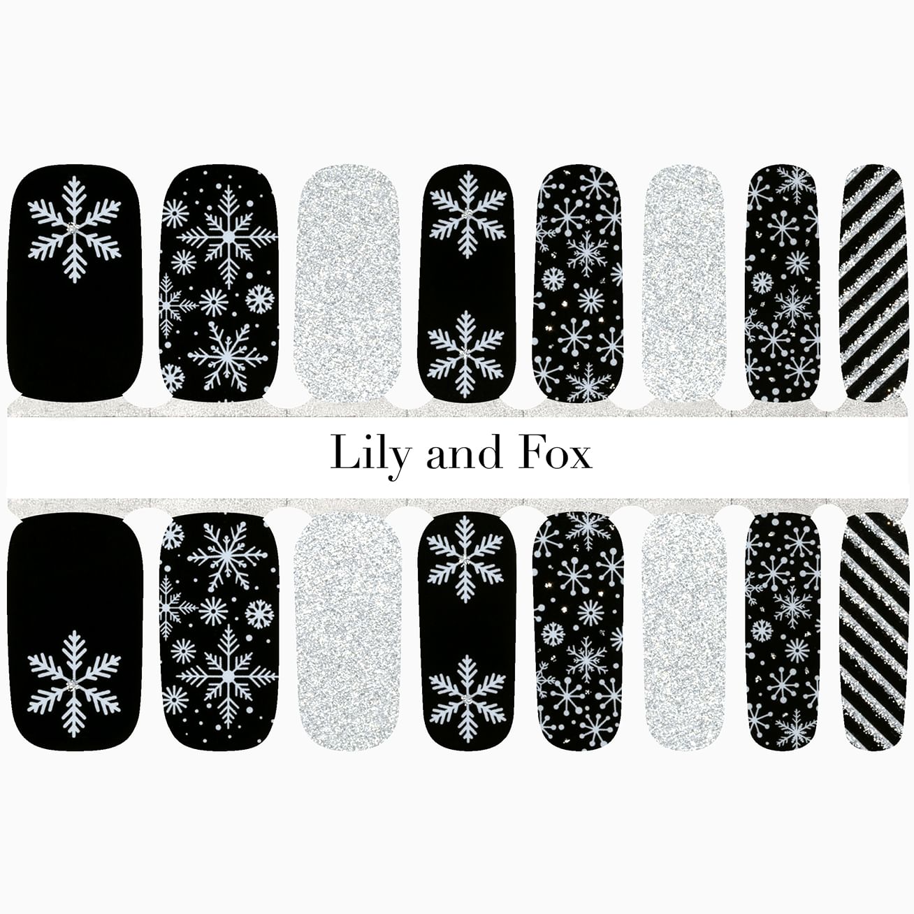 Your nails will be Snow On Point with this wintry mix set with five different designs featuring silver glitter-kissed snowflakes set against a glossy black background, full silver glitter accents, and a dainty black-and-silver striped wrap. Add a layer of top coat to keep this manicure going stronger even longer.