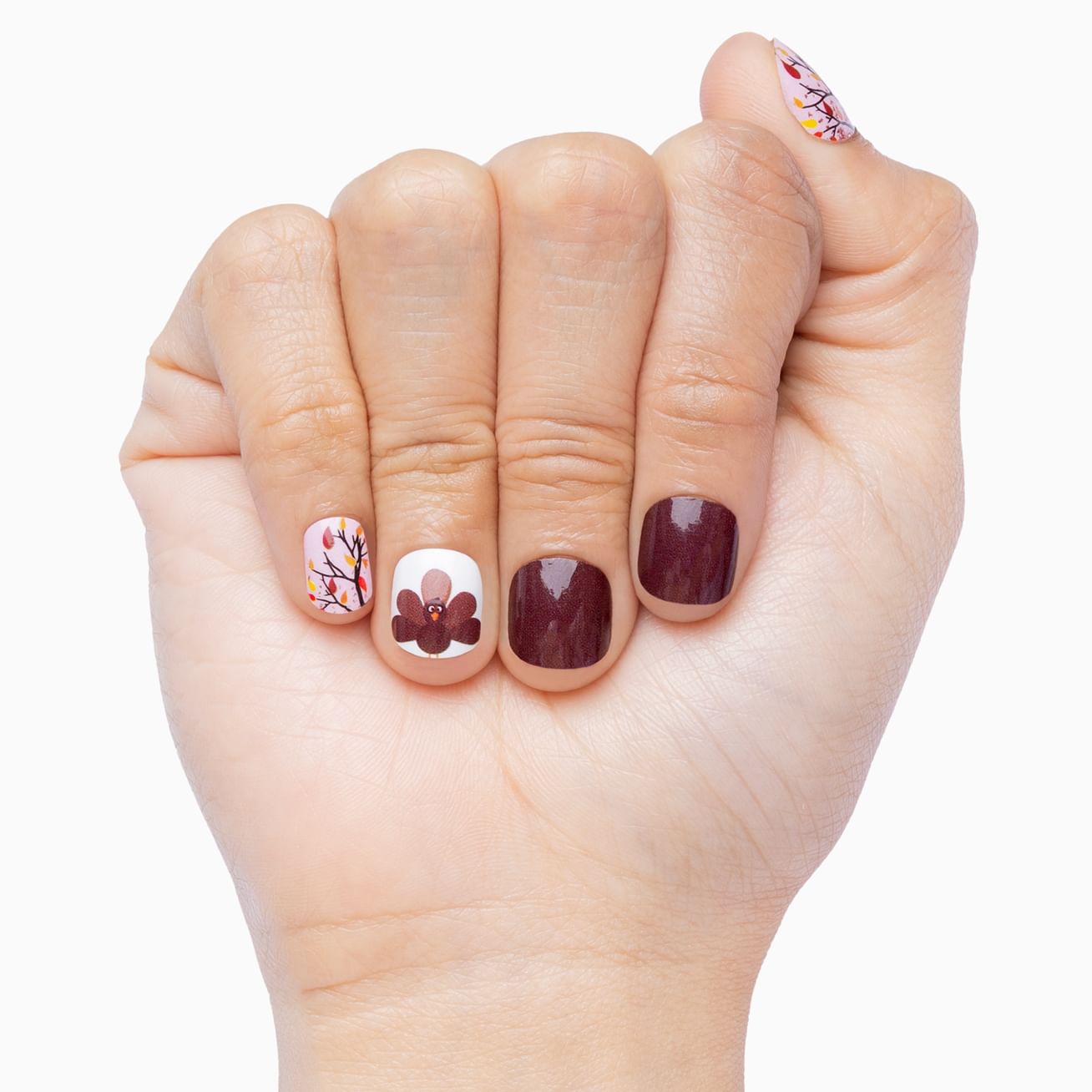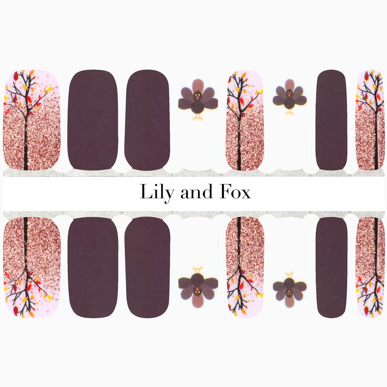 Whether you're running that 5k turkey trot or keeping warm with a mug of hot chocolate (or both?), we can all appreciate the glamour the rose gold glitter brings to this Thanksgiving manicure, featuring glossy mocha solids, adorable turkeys, and the last autumn leaves falling from a glittering tree.