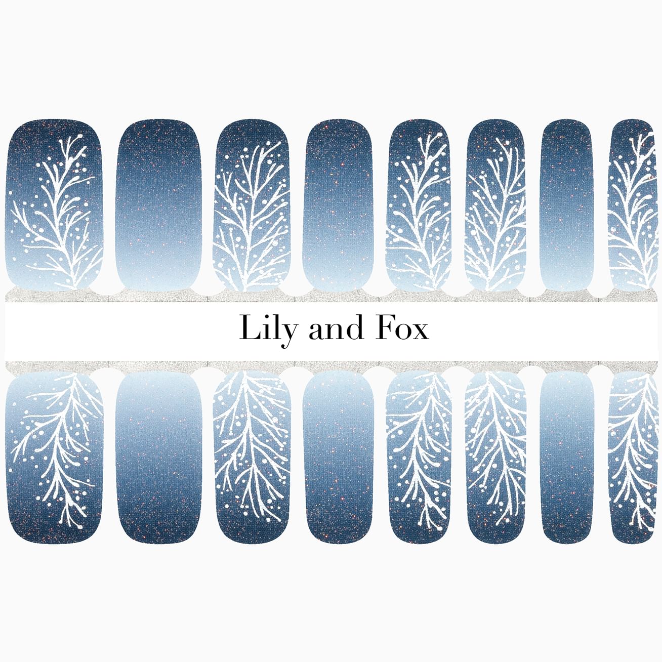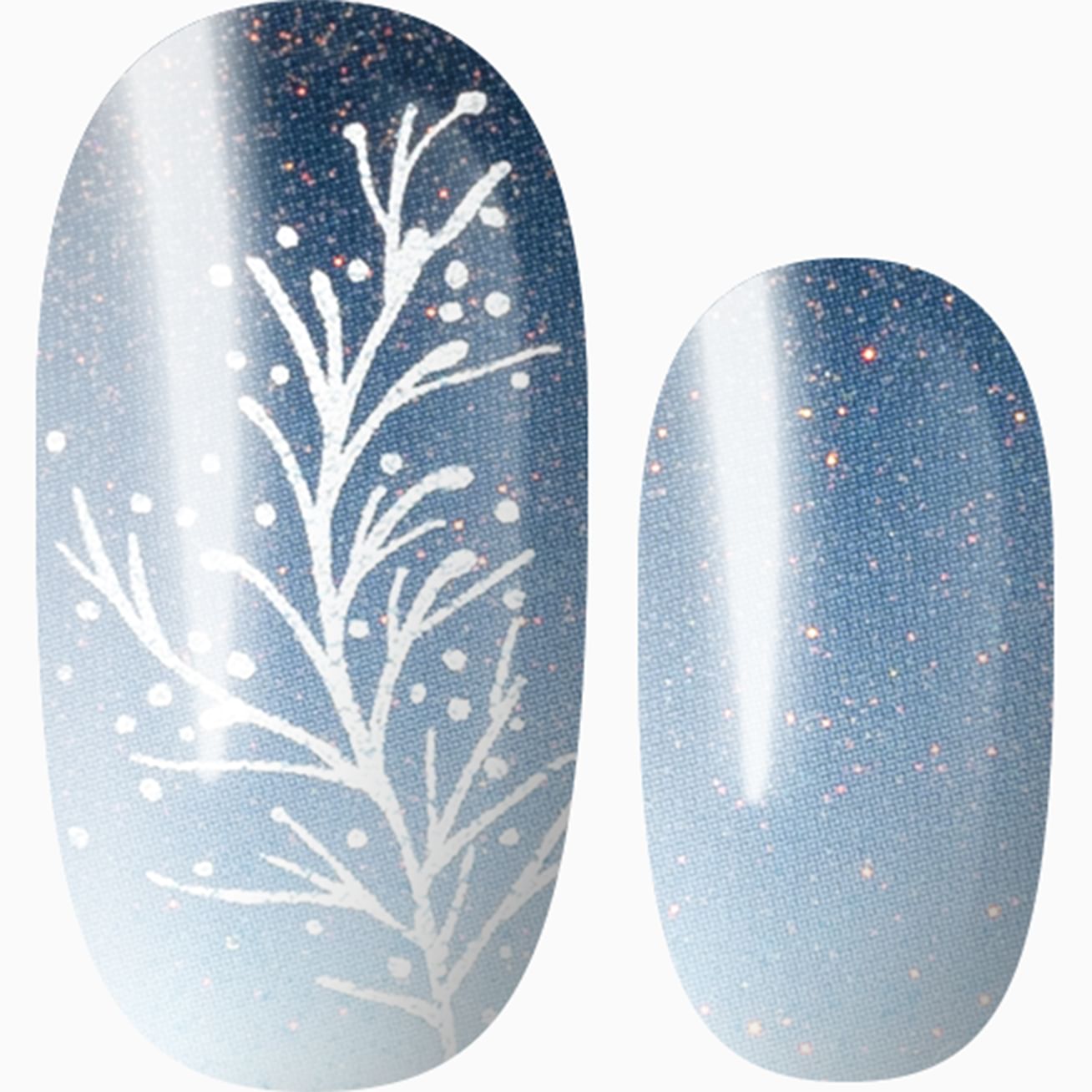 Whispers of Winter features a delicate wintry white branch set against an ombre of dark to pale blue - mix and match the orientation for two completely different looks! Sparse red glitter adds just the right amount of sparkle to this stunning set. Apply in minutes, enjoy for weeks.